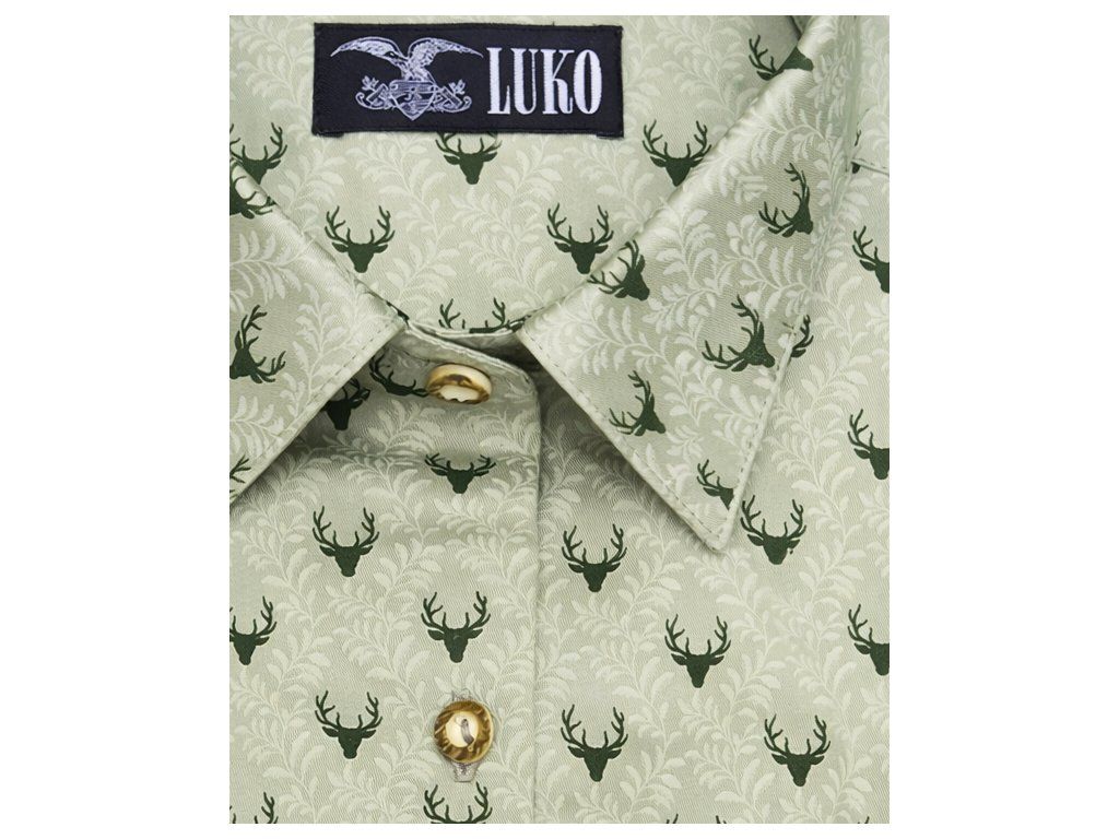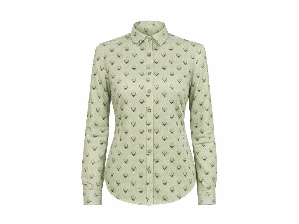 Dámská halenka s dlouhým rukávem ze 100% bavlny v saténovém provedení zelené barvy se vzory zelených jelínků doplněna a ozdobena mysliveckými knoflíky.