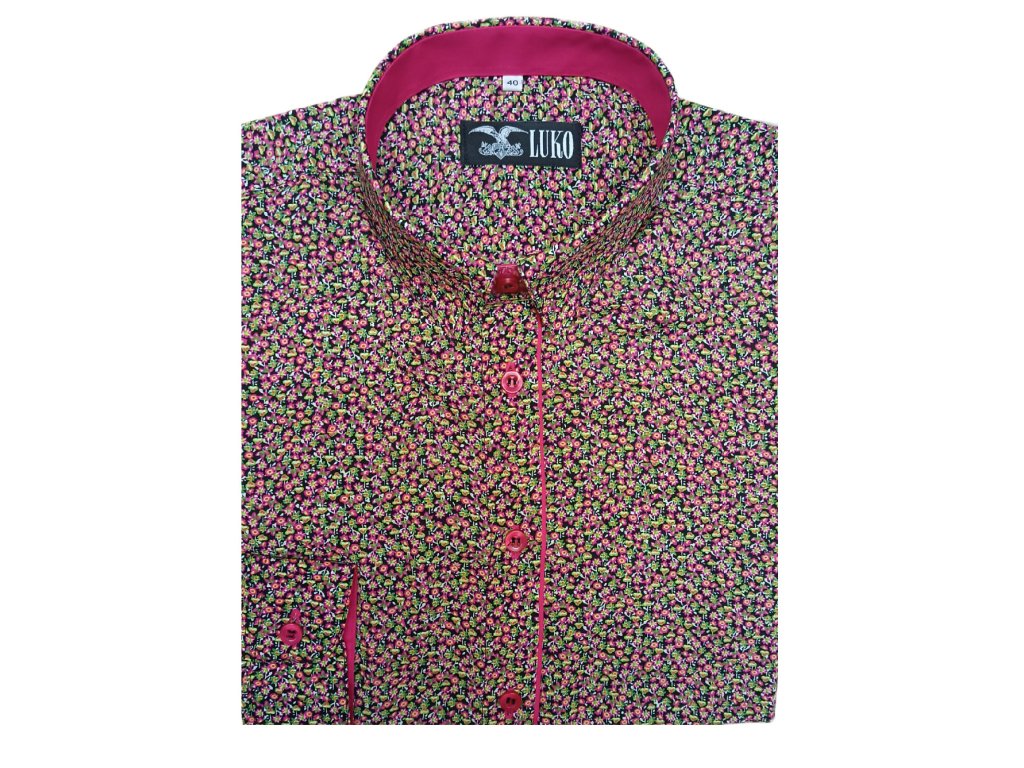 Dámská halenka s dlouhým rukávem ze 100% viskóza se vzory kvítků a ozdobena růžovými knoflíky.