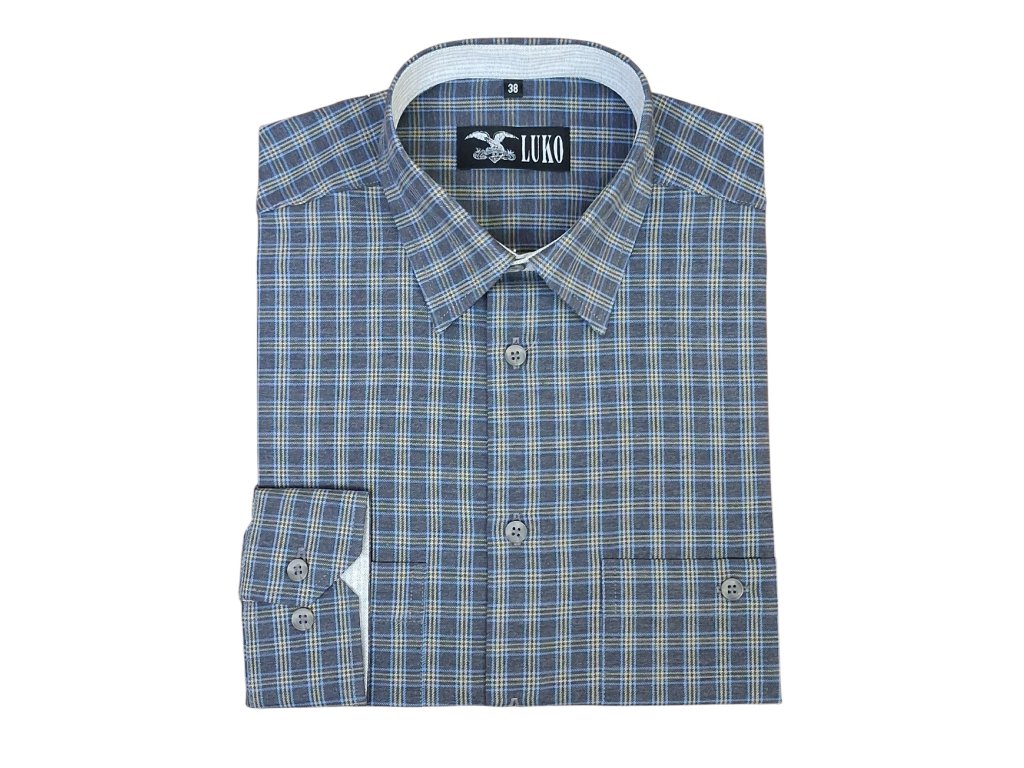 Pánská košile modré barvy se žlutým kárem ve složení 70% bavlna 30% polyester.