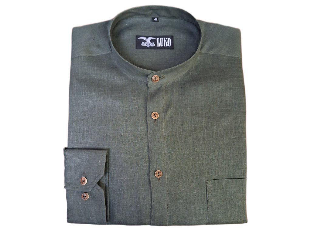 Pánská košile s dlouhým rukávem z kvalitního materiálů 100% len tm. zelené barvy.
