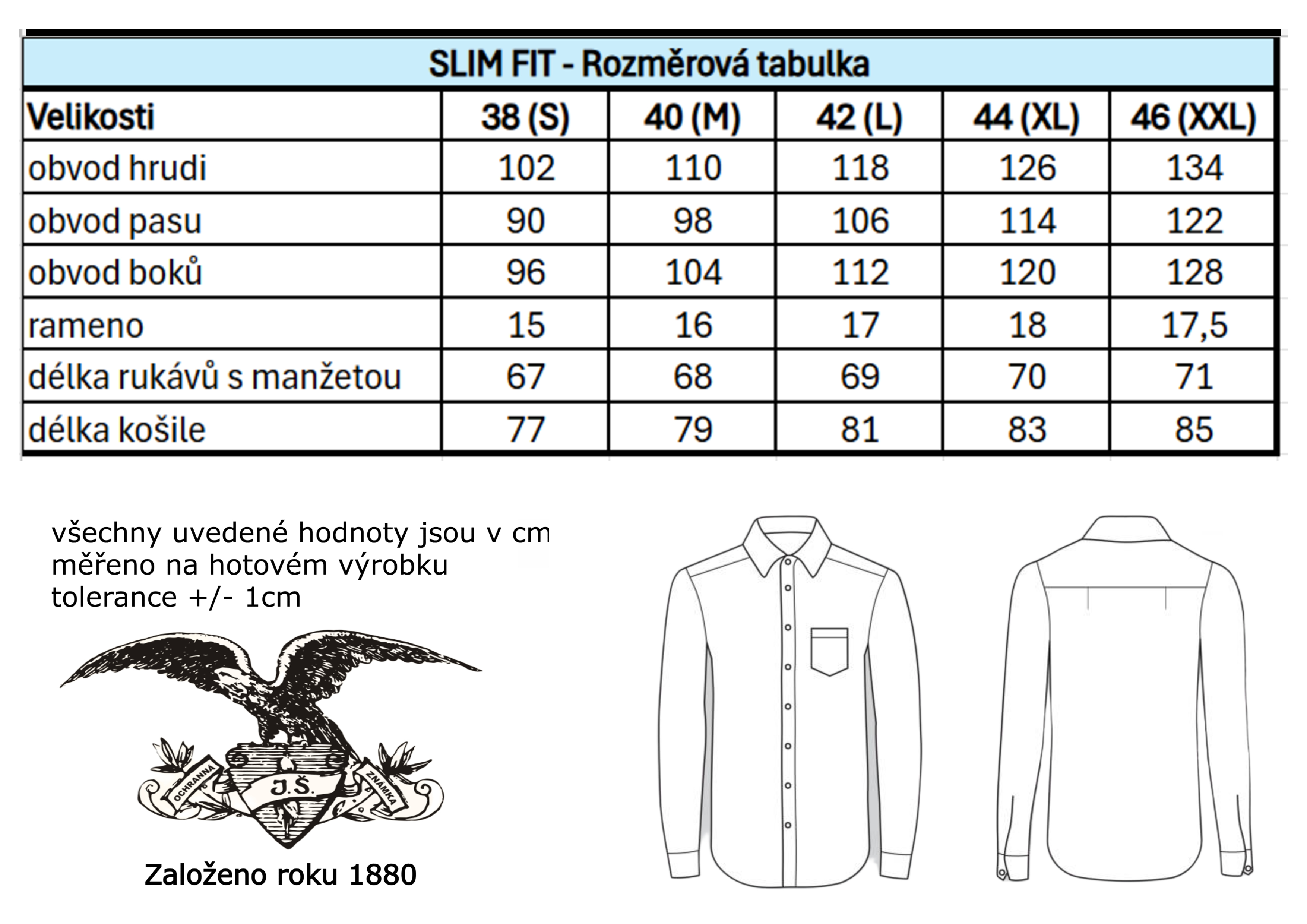 Pokud hledáte košili, která je měkká na dotek, příjemná na omak, má dlouhou životnost, vyznačuje se snadnou údržbou, pak právě jste ji našli. Vysoce kvalitní 100% bavlny twill, dlouhý rukáv, knoflíky z imitace paroží, zúžený střih SLIM FIT... Víc už nehledejte. Jedna kapsa se zapnutím na knoflík je už jen bonusem. Tabulku měr naleznete zde.