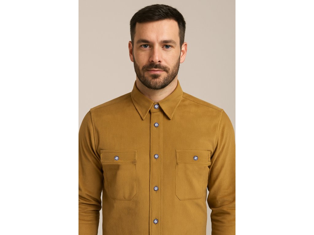 Pánská medová manšestrová košile s dlouhým rukávem ze 100% bavlny se dvěma kapsami na knoflík.