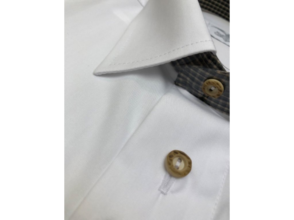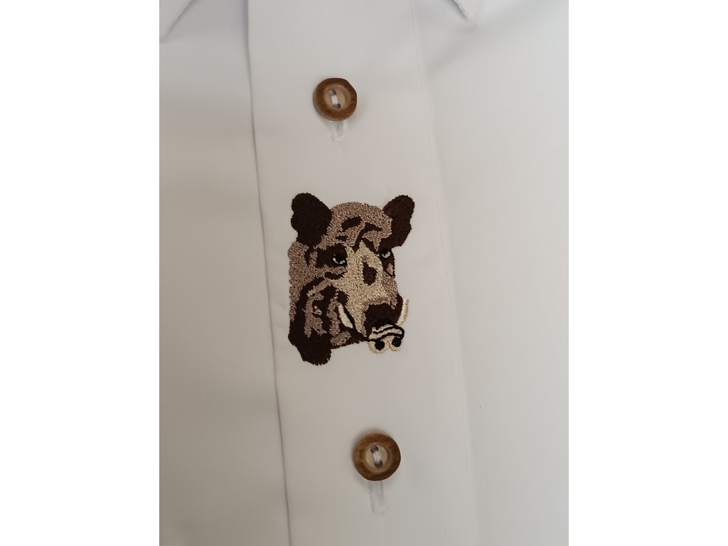 Dominantou košile je výšivka kance, symbol hrdosti a síly, která je vkusně umístěna na hrudi. Kostkovaná kombinace na vnitřní straně límce dodává jemný dekorativní prvek, který vynikne při rozepnutém knoflíku. Skvěle ji doplní například bolo, které nechá výšivku vyniknout
