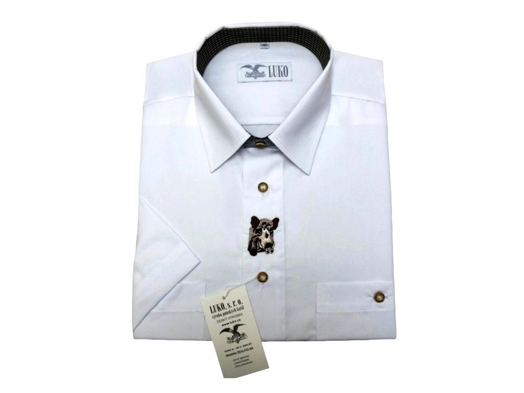 Pánská košile s krátkým rukávem z materiálu 100% bavlna s úpravou easy-care (snadná údržba, snížená mačkavost), s ozdobnou výšivkou kance a kombinací na límci.