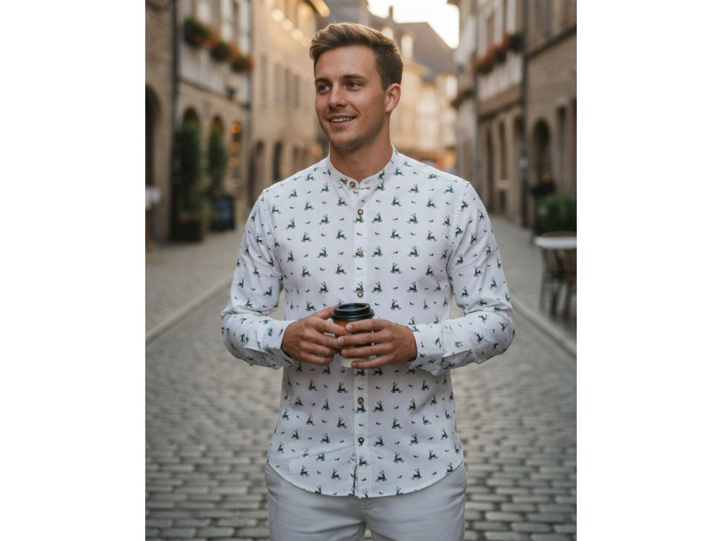 Pánská košile s dlouhým rukávem ze 100% bavlny v saténovém provedení, má střih SLIM FIT. Bílé barvy se vzory zelených jelínků.