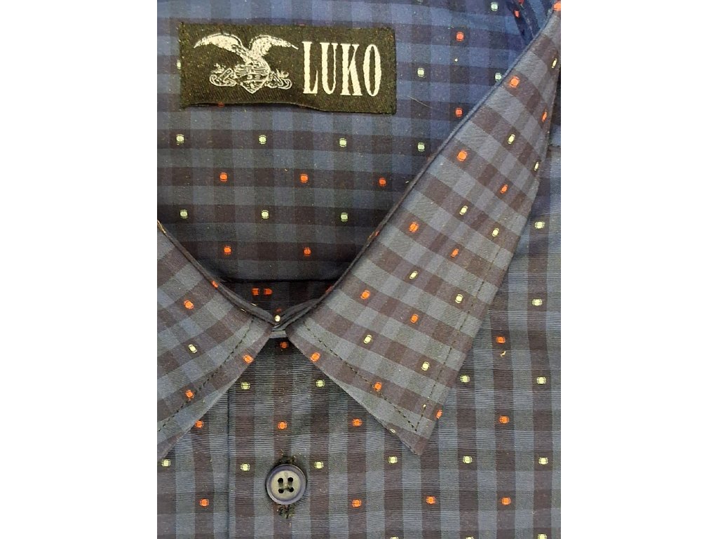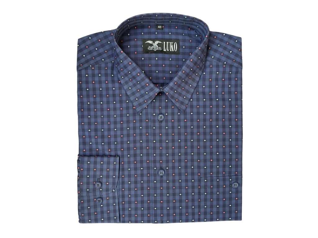 Pánská košile s dlouhým rukávem ze směsového materiálu 70% bavlny a 30% polyesteru, šedé barvy s černou kostičkou a barevnými puntíky. Košile má klasický rovný střih REGULAR