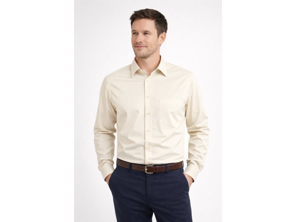 Moderní pánská košile s dlouhým rukávem vyrobená ze směsi 70 % bavlny a 30 % polyesteru. Díky tomuto materiálu nabízí ideální kombinaci komfortu, lehkosti a snadné údržby. Decentní vzor v elegantním odstínu šampáň dodává košili nadčasový a uhlazený vzhled.