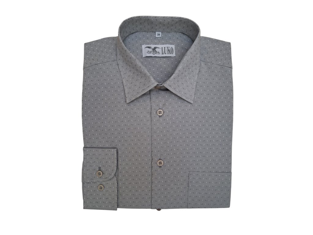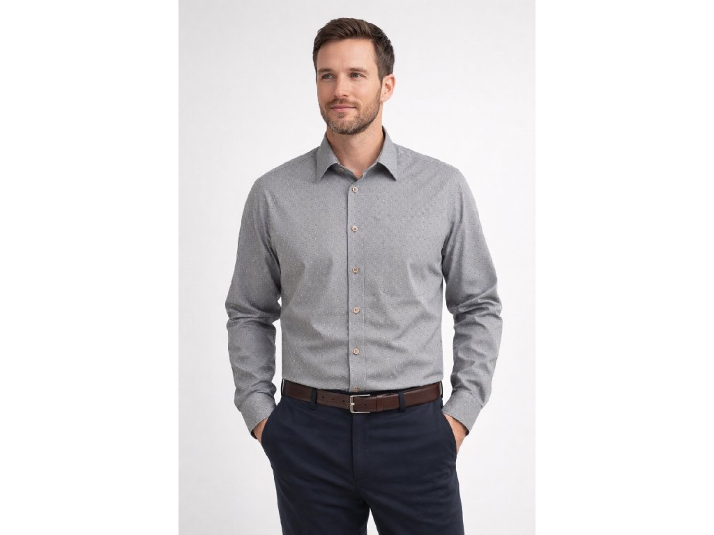 Stylová pánská košile s dlouhým rukávem ze směsového materiálu (70 % bavlna, 30 % polyester), který kombinuje přírodní pohodlí s praktickou nenáročností na údržbu. Jemný šedý odstín s decentním vzorem dodává košili moderní a sofistikovaný vzhled.