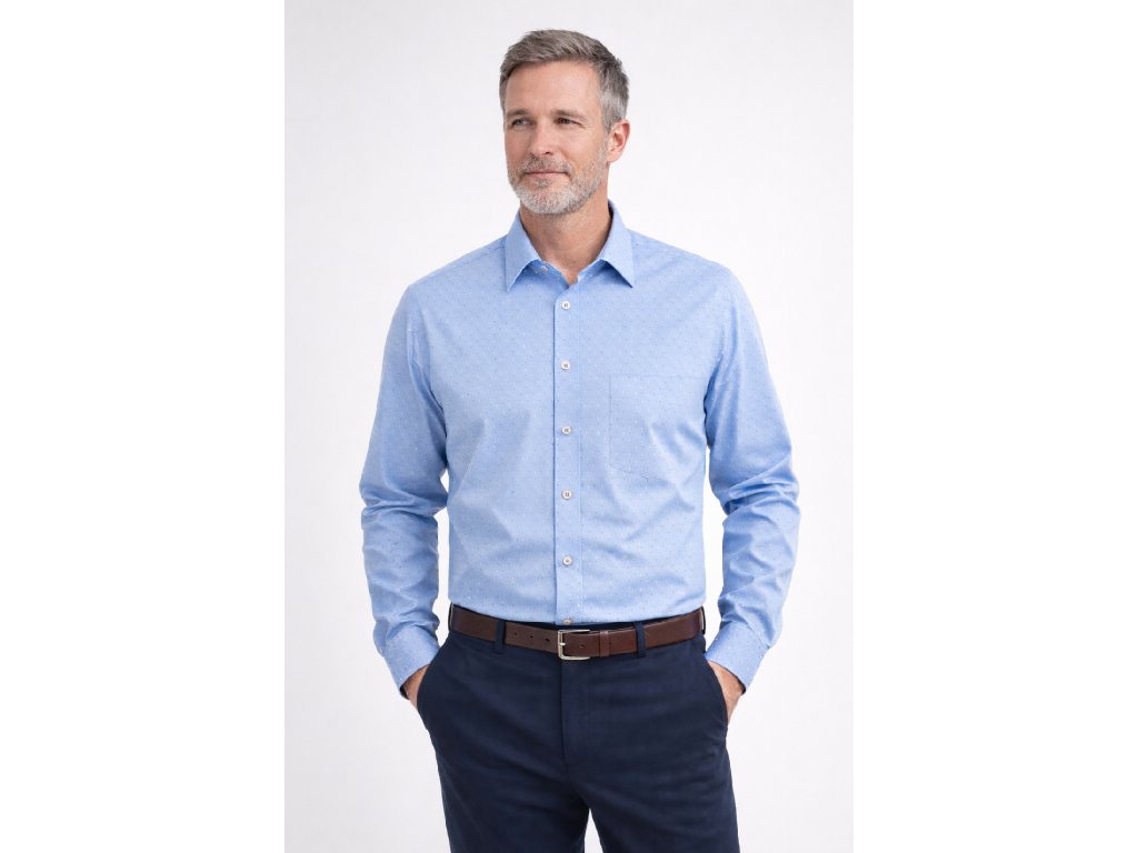 Lehká a stylová pánská košile s dlouhým rukávem, vyrobená ze směsi 70 % bavlny a 30 % polyesteru, která spojuje pohodlí přírodního materiálu s praktičností snadné údržby. Světle modrý odstín s decentním vzorem dodává košili svěží a moderní vzhled.