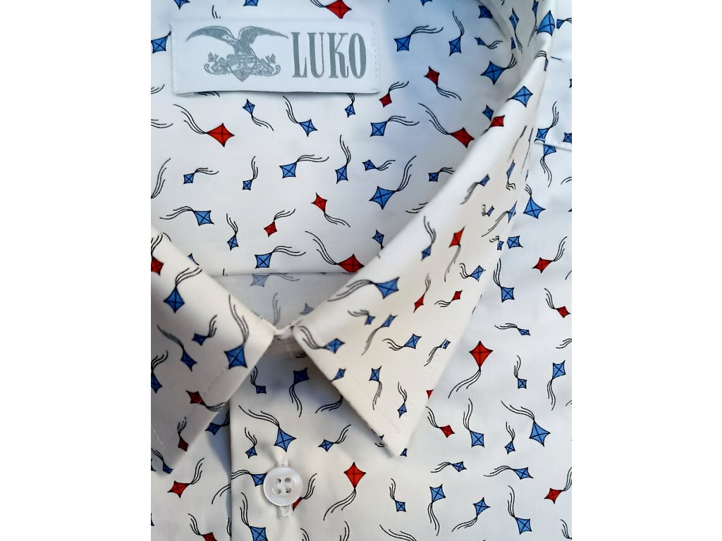 Zbrusu nová pánská košile s dlouhým rukávem z materiálu 100% bavlny a jednou kapsou. Košile má bílou barvu s kombinací modrých a červených draků. Střih košile je klasický rovný REGULAR.