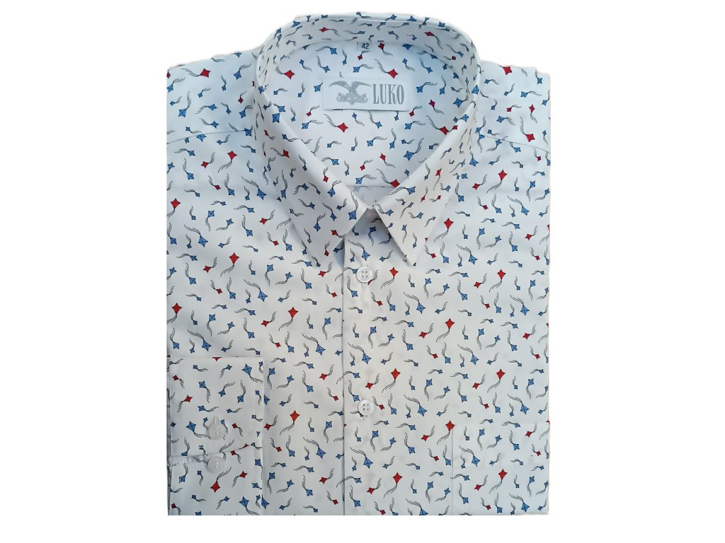 Pánská košile s dlouhým rukávem z materiálu 100% bavlny, bílé barvy se vzorem modrých a červených draků.