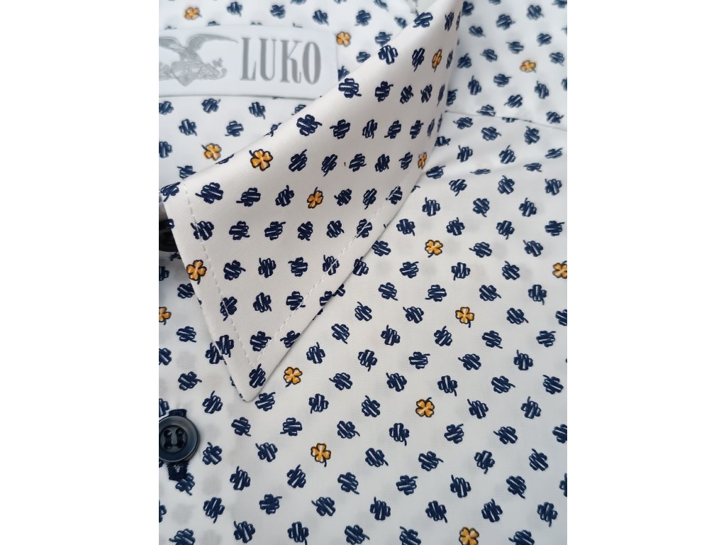 Zbrusu nová pánská košile s krátkým rukávem z materiálu 100% bavlny a jednou kapsou. Košile má bílou barvu s kombinací žlutých a modrých čtyřlístků. Střih košile je klasický rovný REGULAR.