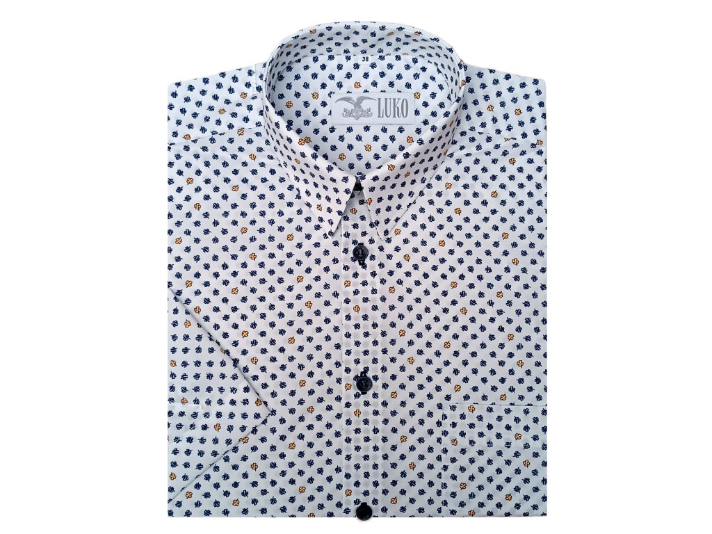 Pánská košile s krátkým rukávem z materiálu 100% bavlny, bílé barvy se vzorem žlutých a modrých čtyřlístků.